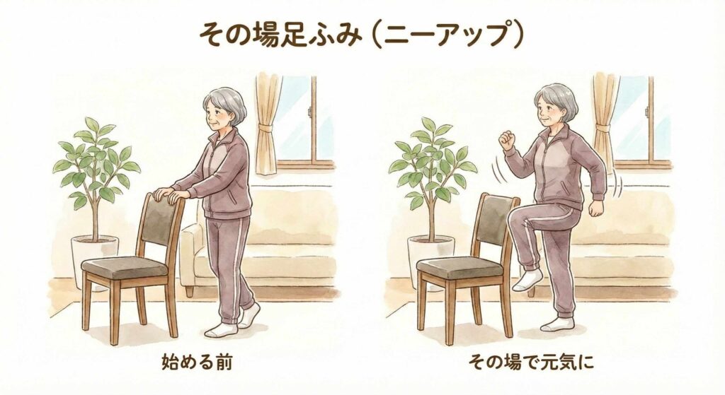 その場で、膝(ひざ)を交互に高く持ち上げる運動です。歩くときに「足が上がらなくて、小さな段差でつまずく」のを防ぐためのトレーニングです。